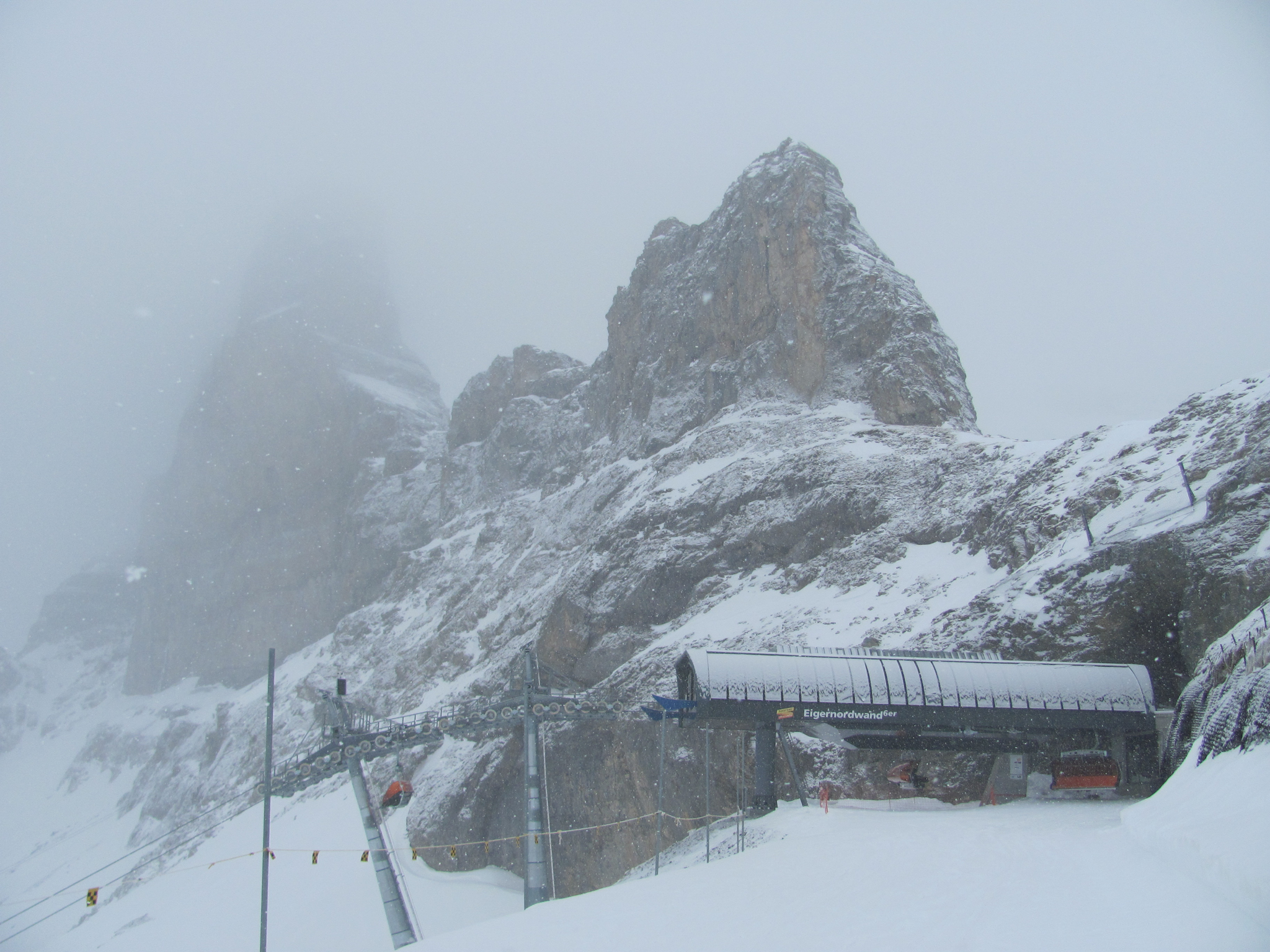 Otherwise, though, it was mostly foggy. We skied the first half of the day on the Kleine Scheidegg side, then took the train down the hill, walked 15 minutes to the gondola, and went up to the First side. It wasn’t better, but it WAS slightly different. All the Talabfahrts were gesperrt, which seemed unfortunate given that there would have been some trees there to break up the flat light. Each lift seemed to have only one skiable run. The goulash soup in the one hut was pretty decent. Rental skis picked up in Bern were not well tuned. Had never been on chairlifts with the bubble screens before; they were cool, if maybe unnecessary on the given day (wind was no problem). It was good to see that Swiss snowboarders also like to make unpredictable stops and turns, made me feel more okay about being an American. Swiss German is unintelligible to me (I’m reasonably fluent in German German).