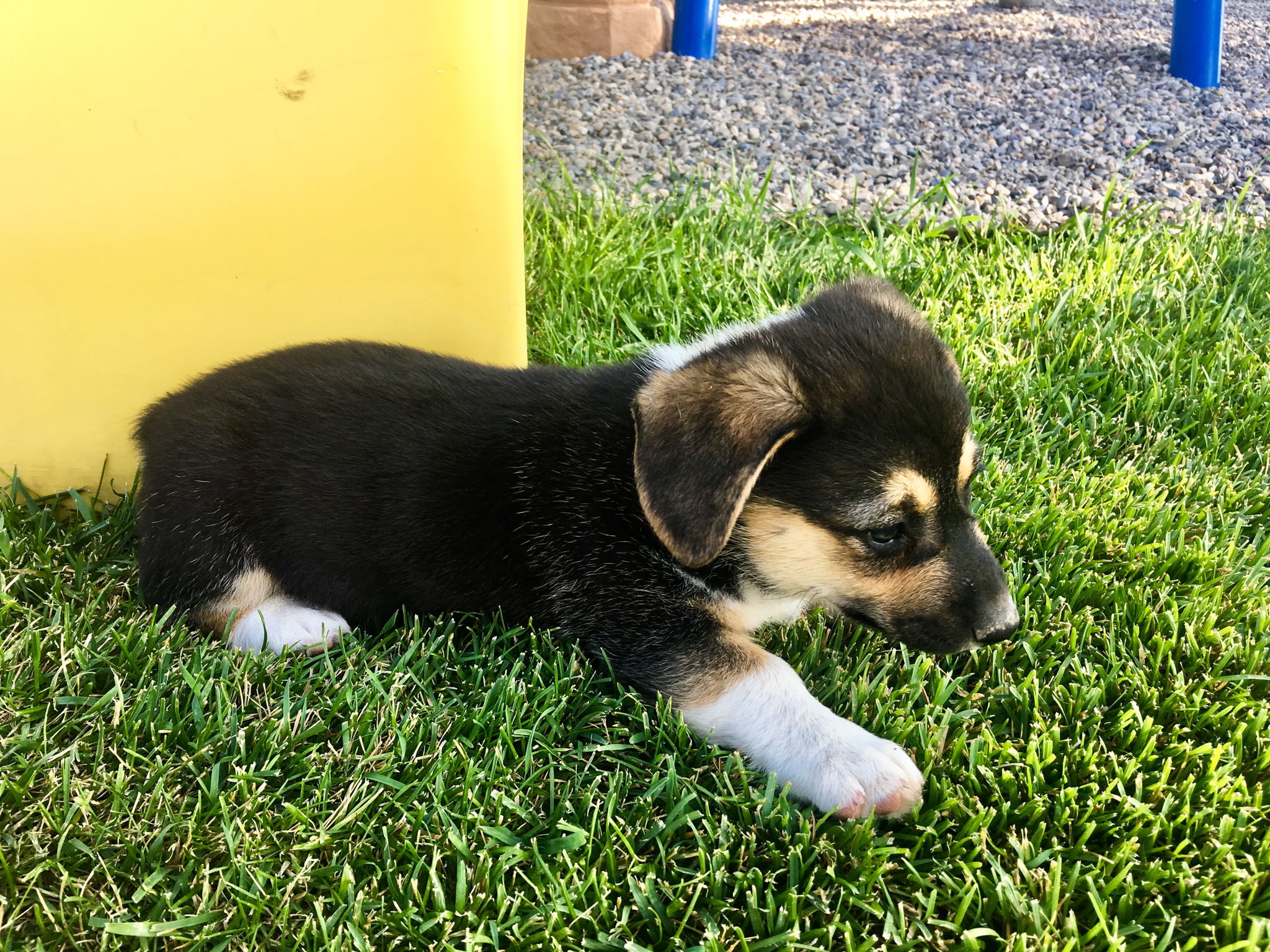 The girl was adventuresome and tried to climb up the slide on the breeder’s backyard swing-set; the boy waited till I wasn’t looking, then dug his sharp little puppy teeth into my back …. So: I chose the girl, and, only $900 later, we were on our way home.