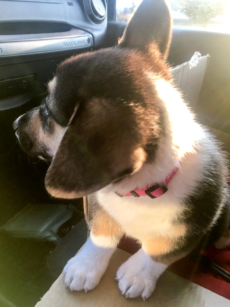 The girl was adventuresome and tried to climb up the slide on the breeder’s backyard swing-set; the boy waited till I wasn’t looking, then dug his sharp little puppy teeth into my back …. So: I chose the girl, and, only $900 later, we were on our way home.
