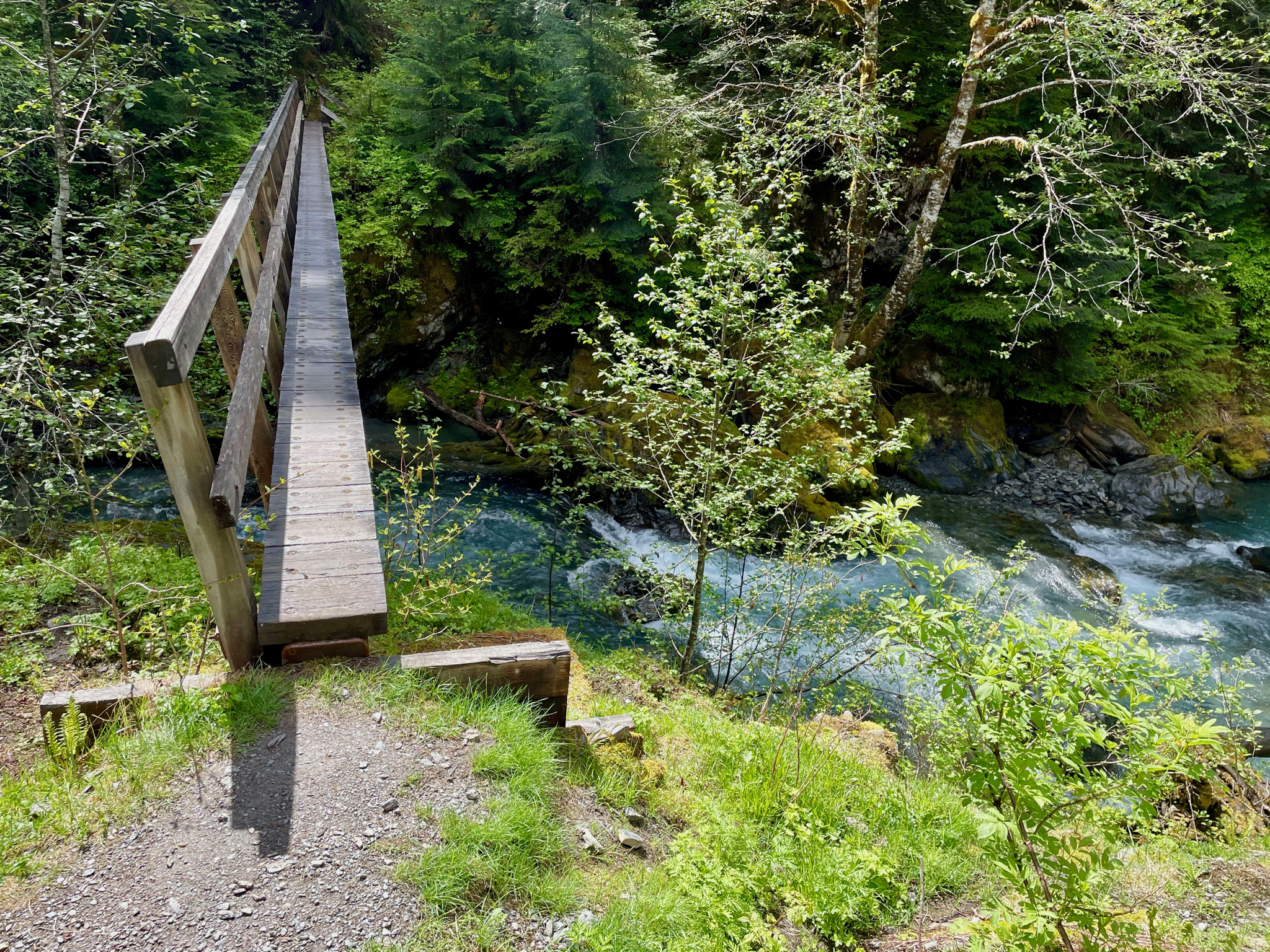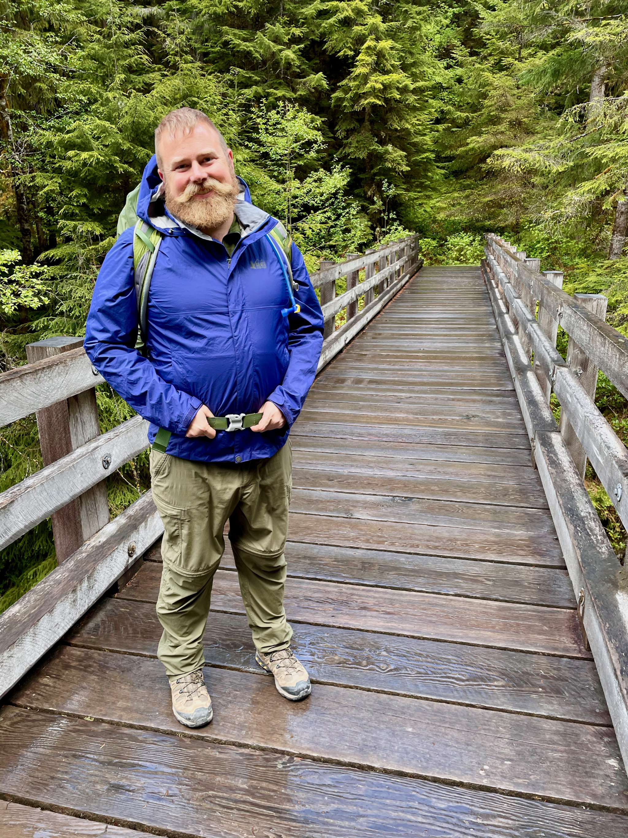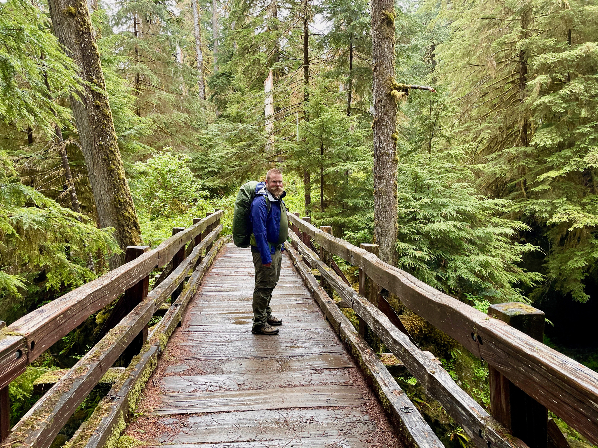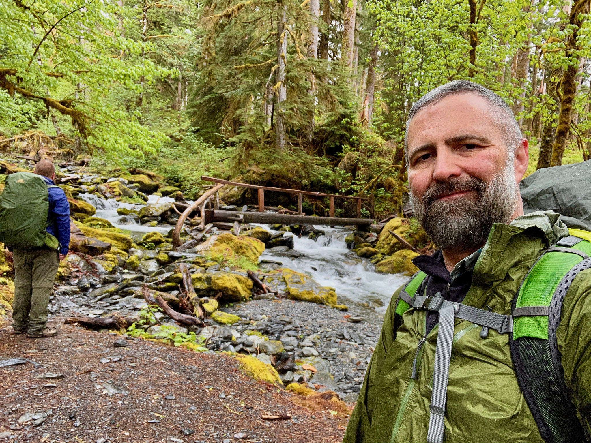 That last photo is this hike in a nutshell: a lot of green, overgrown log bridges with railing on only one side, drizzle that occasionally morphs into real rain. Not east-coast real rain, just the west coast kind. We did this hike over three calendar days and two calendar nights. About 48 hours from put-in to take-out. The first major check-point on this hike (which doesn’t involve a lot of check points) is the Pony Bridge. It’s a pretty good descent to get there (which, on day three, becomes the most irritating of ascents). But, here’s Ben enjoying wetness from the Pony Bridge: