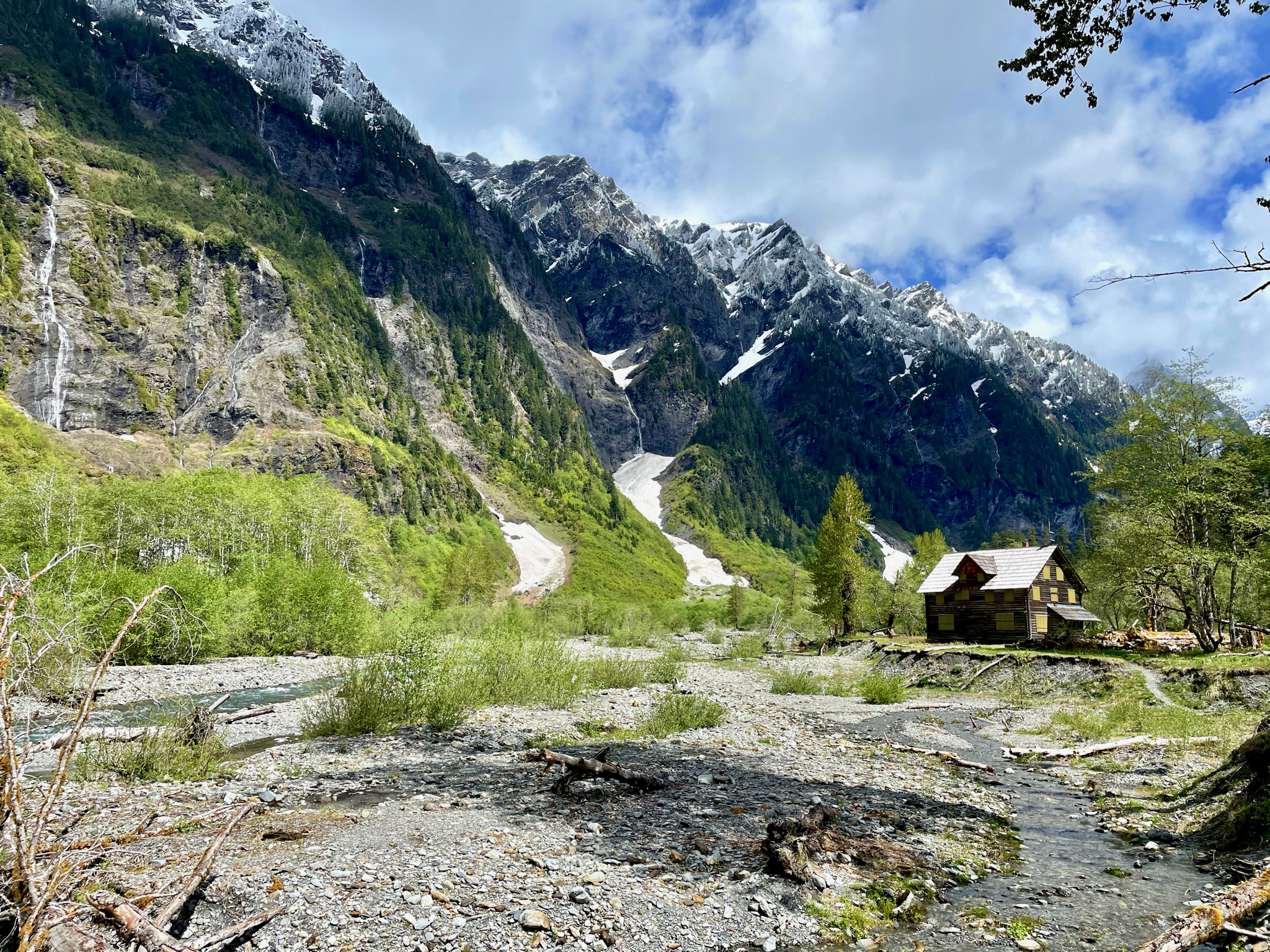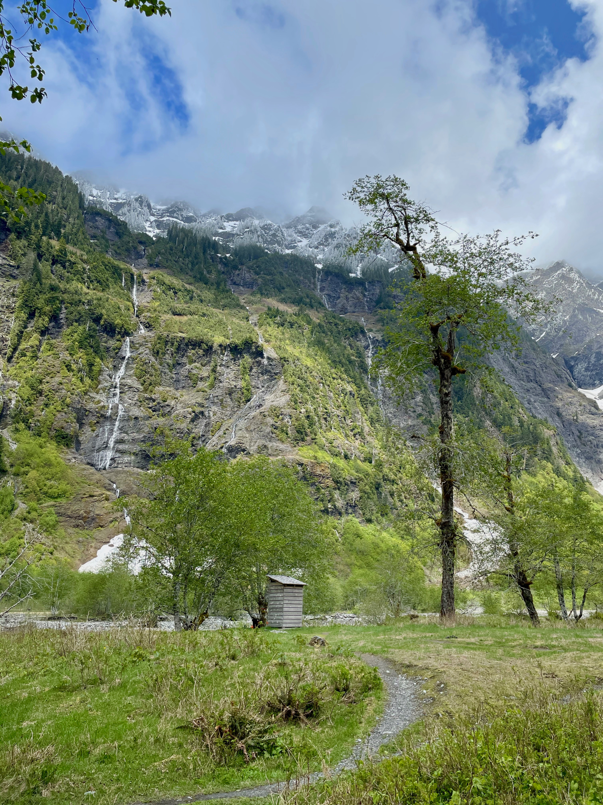 The actual Enchanted Valley involves much sorcery and photographs can’t convey how awesome it is. There were waterfalls everywhere we looked, plus the sheer rock walls of the mountain, the river, the closed-down back-country ranger station, and, and, and everything. I dunno. Here were some attempts.