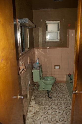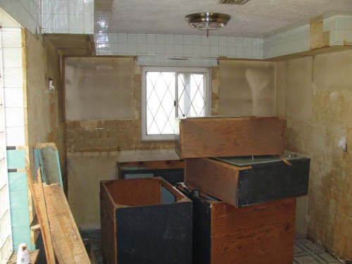The one cabinet where the sink used to be is still attached to the wall. I’m probably just going to obliterate it in order to get it out of there — the pipes, you see. The pipes go through it, you see. So, you see, you can’t just pull it off. I’m guessing there’s some magical, easy way to get it off of there, if only I knew the secret, but fwiw I’ll probably kind of enjoy hacking into it with my hammer and pry bar.