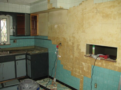 For some reason the person who did the tiles on the lower 4 1/2 feet of the wall used a ton of glue. Whoever did the top half was considerably more considerate. You can kind of see that in the photo (top half clean, bottom half problematic). Someone online suggested a heat guy as a simple way to get the stuff to just fall right off the wall. I’m starting to realize that people who post to online forums aren’t always right. Realize again, I mean. Just like someone else on some other forum said to never try to take wall cupboards down by yourself. I did it by myself and I’m really not that big a deal. Apparently it’s possible.