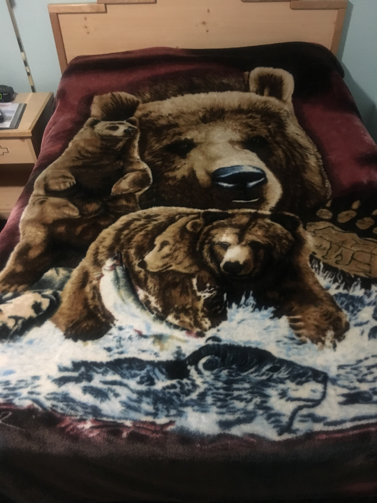 The bedspread was probably my favorite part, although everything else in the room was similarly bear-themed (the artwork, the phone, the floor mat, soap holder, shower curtain, towel bar, etc.). Impressive.