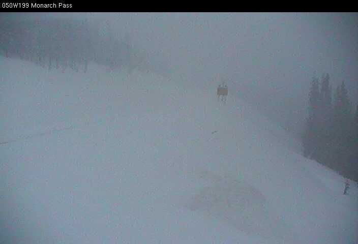 Wednesday night, it snowed so much that the highway up to the resort was closed all day Thursday. So: they closed the ski resort on account of snow. I watched the Colorado DOT website all day. It’s pretty amazing — you can track the movements of each of the state’s snow plows, including their speed, direction, and the area they’ve covered in the last half-hour. Uh, plus they tell you whether the highways are open (mostly they’re open, just not the one). This is what the Highway 50 camera showed for Monarch Pass: