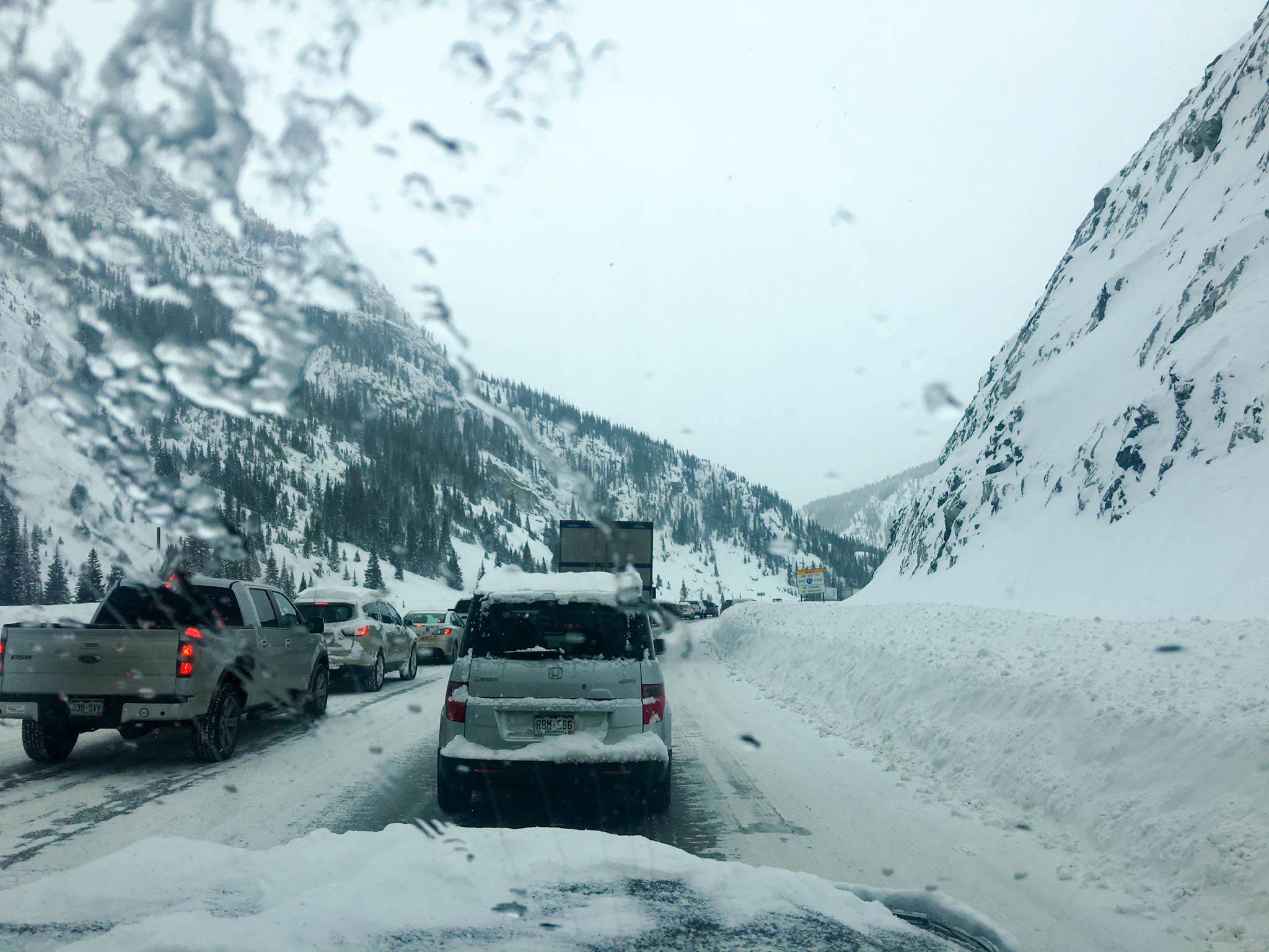 On the Tuesday on our way up there, it had snowed so much overnight that they closed the freeway between Copper and Vail, yielding traffic that looked like this: