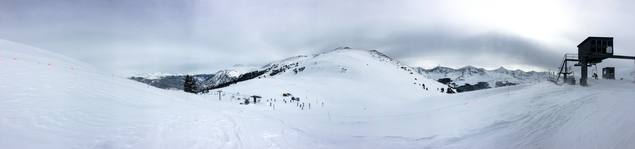 Here’s a panorama shot I thought was decent from the top of the mountain. It’s the Rendezvous lift at left and the top of Blackjack at right.