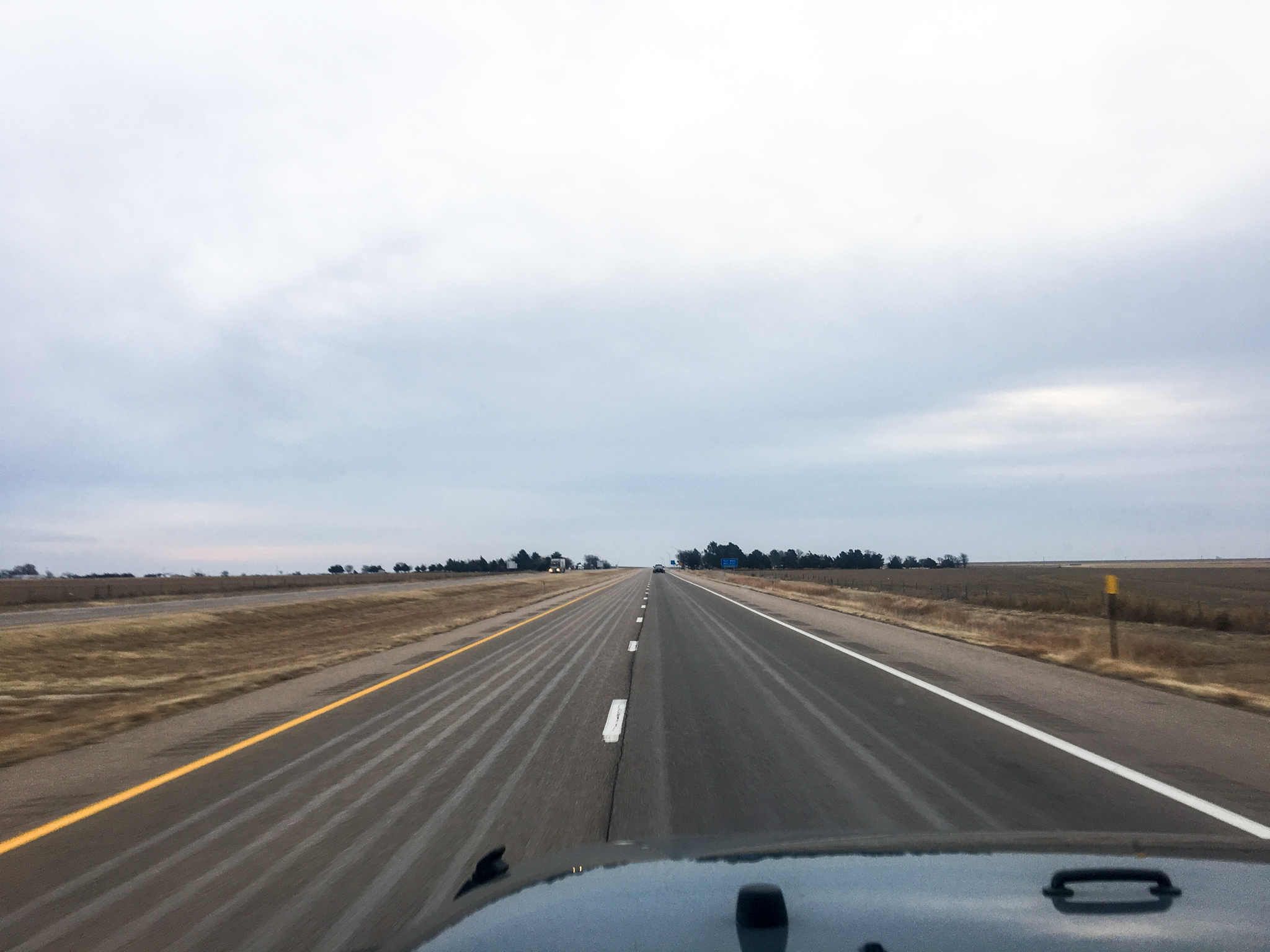 My drive back was during the weekend of The Great South Plains Ice Storm of ’17. Kansas geared up for it by painting wet-look stripes all over I-70.