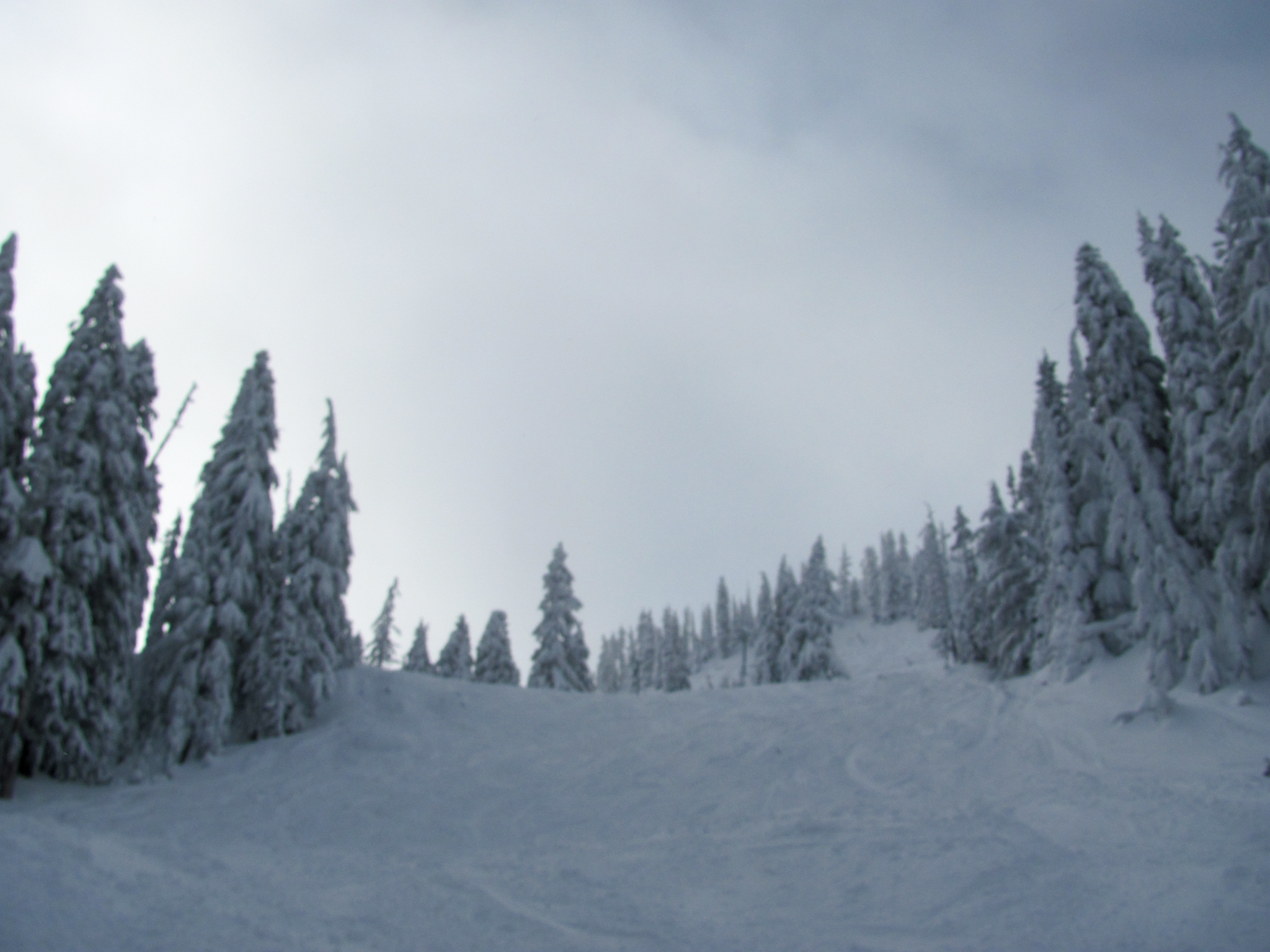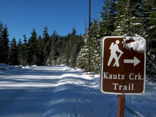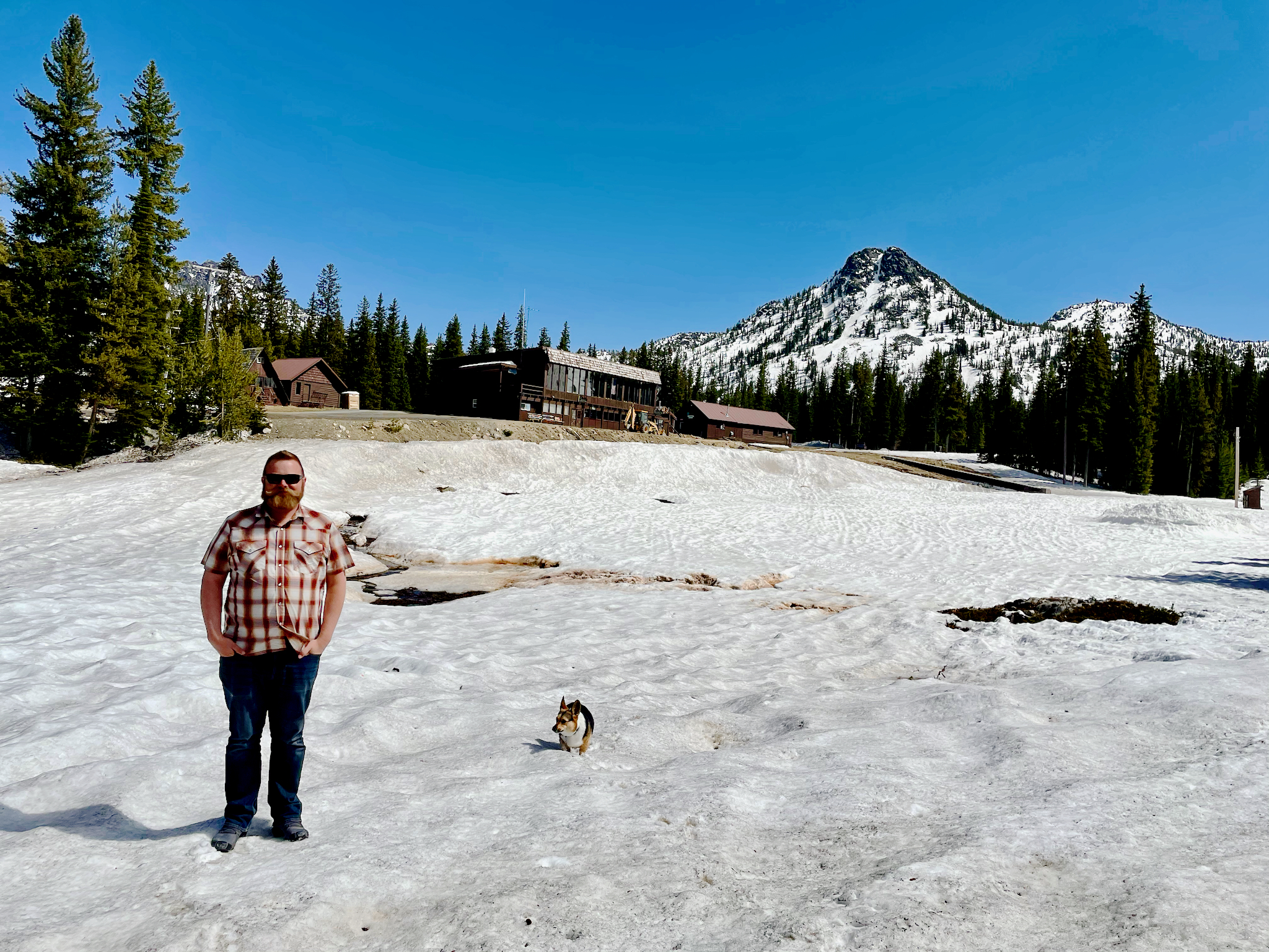 Planning out the route, I thought it’d be fun to cap off the first day of travel (from Ogden to Pendleton) by hitting a quick day-hike in the Blue Mountains. I identified the Hoffer Lakes Trail as one that people seemed to like and that was dog-friendly. Got off the freeway in North Powder, then started heading toward the hills. About halfway up the mountain, we were still climbing hard, and it became increasingly clear that, uh, there was still way too much snow for us to conduct any actual hike.